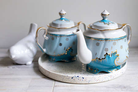 A blue porcelain tea set on the table. Teapot and cups of tea. Hare figurine.