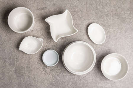 Assorted white empty bowls and plates on a stone background. Different ceramic dishes and kitchen utensils, top view
