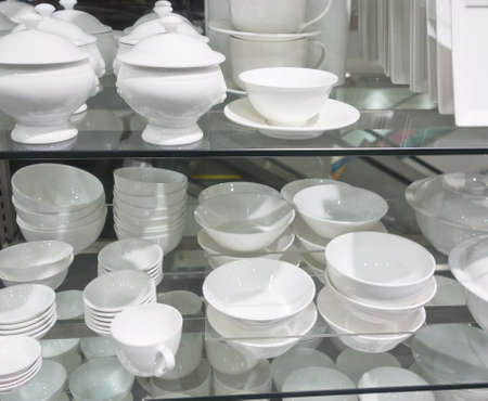 Ceramic or porcelain tableware on wooden pedestal on store shelf. Ceramic texture
