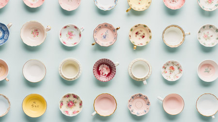 Stack of teatime tableware. Porcelain cups and saucers on a white wooden background. High key food photography.
