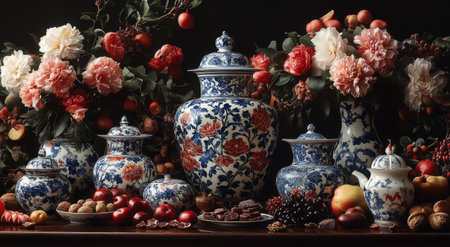 An elegant arrangement features intricate porcelain vases surrounded by fresh flowers and an assortment of fruits. The setting highlights vibrant colors and detailed patterns.