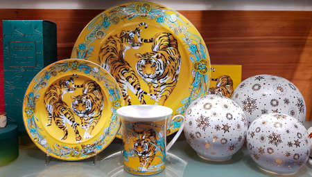 LATVIA, RIGA, DECEMBER, 2021: Collection set of porcelain tableware with the symbol of 2022 on shelf in Riga, Latvia. Great gift concept.