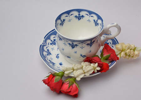 Vintage porcelain cup and saucer on a gray background