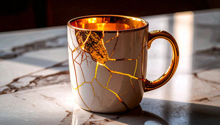 Realistic white ceramic mug with broken parts repaired using gold kintsugi placed on marble surface, natural light, concept of resilience and healing