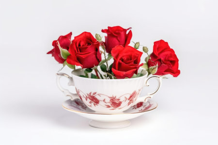 red roses in a vintage tea cup on white background, created with generative ai