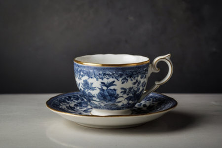 Tea cup and soucer with flower patterns over a neutral background.
