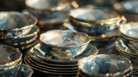 A collection of vintage porcelain bowls with delicate floral patterns and golden rims stacked together. The warm lighting enhances the elegant craftsmanship and antique charm of the dishware.