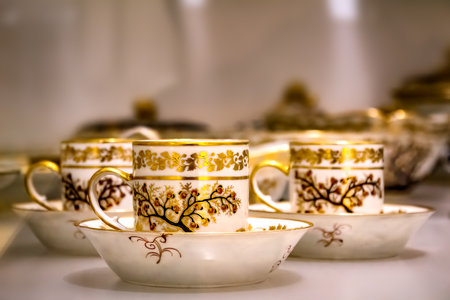 A closeup shot of luxury cups for coffee with beautiful patterns