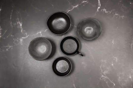 Ceramic bowls on a gray marble kitchen counter in a top view
