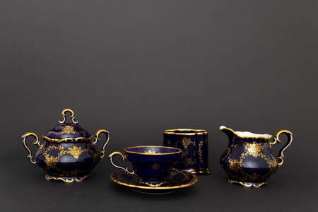 Closeup of a beautiful cobalt blue colored vintage porcelain tea set with golden floral pattern on dark gray background. The set includes a a sugar bowl, a milk jug and a tea cup.