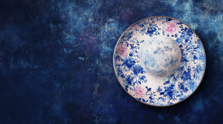 Elegant blue porcelain plates arranged symmetrically around blank white center for design placement