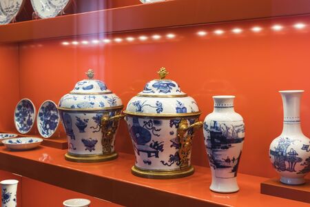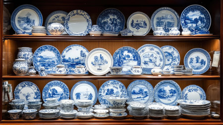 Discover a stunning display of blue and white porcelain dinnerware, showcasing intricate designs and craftsmanship, perfect for enhancing any kitchen or dining space.