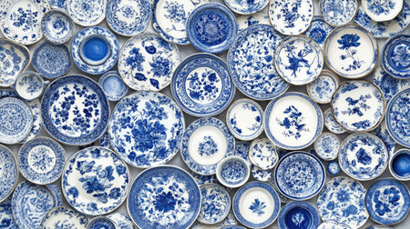 An elegant arrangement of blue and white ceramic plates showcasing intricate patterns. Ideal for culinary presentations, home decor, or as a vintage collection.