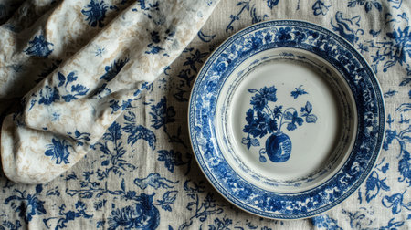 A vintage blue and white decorative plate sits gracefully on a beautifully patterned floral fabric. This still life composition showcases elegance and craftsmanship in home decor.