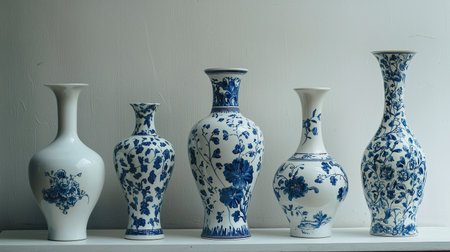 A beautiful arrangement of five elegant blue and white porcelain vases showcasing intricate floral patterns and traditional craftsmanship. Perfect for home decor.