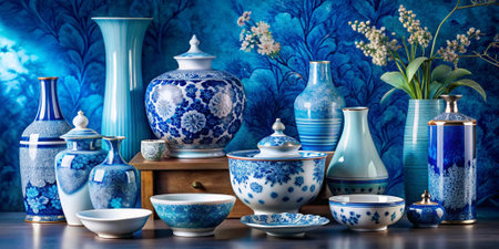 Top-Down View of Cyanotype Artworks and Blue Ceramic Dishes. Artistic Composition in Blue Tones.