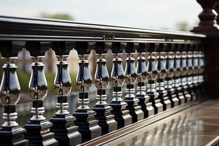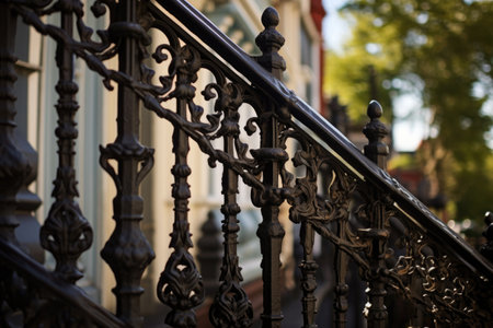 a close-up of intricate wrought iron railings of a victorian porch, created with generative ai