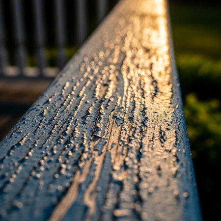 Close-up of a deck railing showcasing detailed textures with soft ocean reflections. The minimalistic composition highlights the serene marine environment and bright lighting.