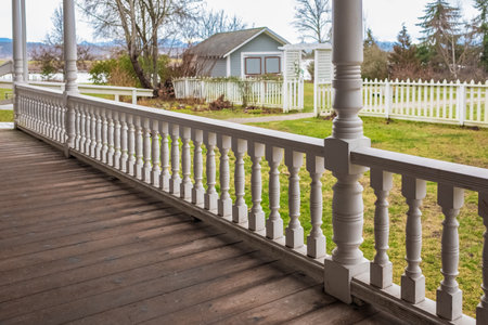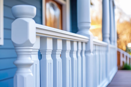Charming white porch railing with blue house background.