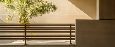 A balcony showcases a sleek railing and a tall palm tree. Soft natural light creates interesting shadows on the walls enhancing the contemporary aesthetic of the space.