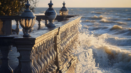 Elegant balustrade along the shore with a classic lantern, waves crashing in the background.
