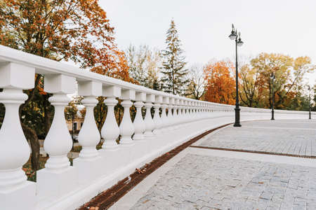 white balustrade in the park with yellow leaves on the background