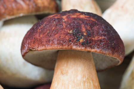 Mushroom Boletus over Wooden Background. Autumn Cep Mushrooms close up.