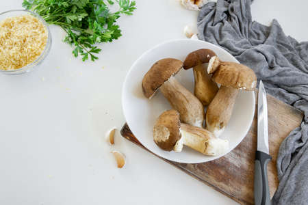 Cooking Boletus edible (Porcini) mushrooms, white background, space for text