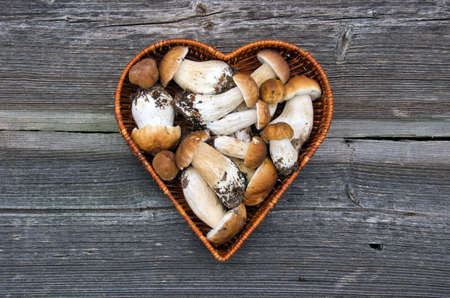 edible mushroom fungi boletus in heart form wicker basket on old wooden background
