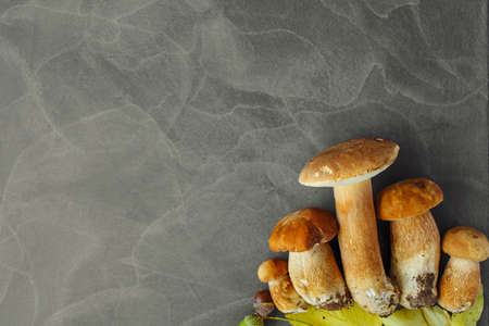 autumn fall composition. Raw edible mushrooms Penny Bun on dark black stone shale background. Ceps over gray table. Cooking delicious organic mushroom gourmet food. Flat lay top view copy space