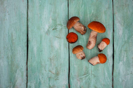 Mushroom Boletus over Wooden Background. Autumn Mushrooms