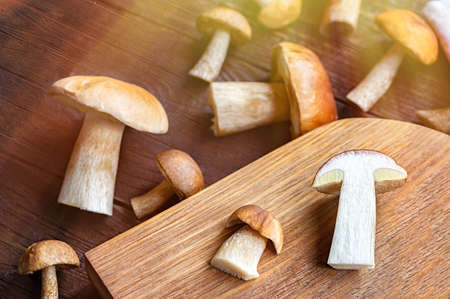 A pile of noble forest mushrooms boletus and red cap boletus lying on a wooden board