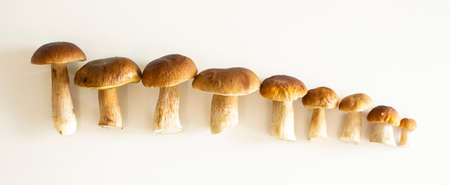 Fresh wild porcini mushrooms (boletus edulis) on white background copy space