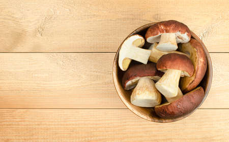 Boletus edulis mushroom on wooden background. Copy space. Top view. Organic forest food, edible fresh picked Porcini mushroom. Autumn harvest concept. Cep mushroom picking
