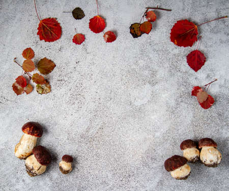 Porcini mushrooms and autumn red leaves on gray textured background, frame