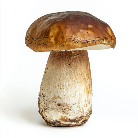 This image features a close-up view of a brown mushroom showcasing its smooth cap and textured stem set against a clean white background, perfect for food-related projects.