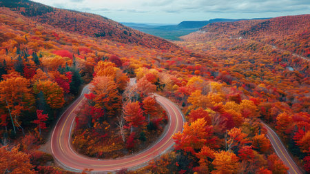 Scenic drone shot of a winding path traversing a valley surrounded by hills blanketed in brilliant fall colors. this vibrant natural landscape evokes travel and seasonal beauty.