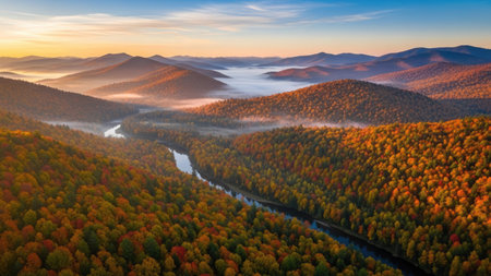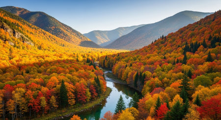 Winding river reflecting vibrant autumn colors of the dense forest valley. scenic landscape with colorful fall foliage on rolling hills under a clear sky.