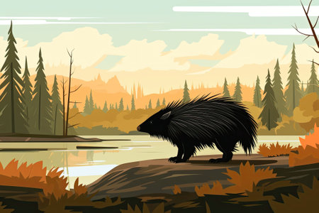 A serene scene featuring a porcupine foraging through vibrant orange leaves in a peaceful forest, showcasing autumn's beauty and wildlife interaction.