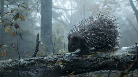 Porcupine perched on a moss-covered fallen log in a misty forest, highlighting the tranquility and mystery of wildlife.