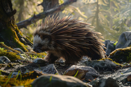 A curious porcupine wanders across a rocky woodland, its quills glistening in the soft morning light. The lush greenery and dew-covered moss enhance the serene beauty of the forest.