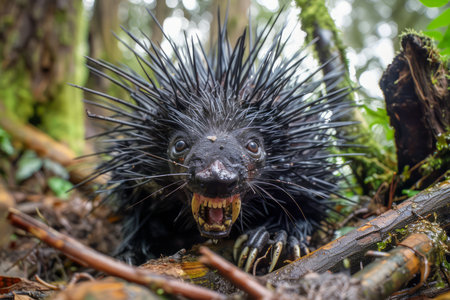 Spiky Black Porcupine in Natural Habitat Looking Directly at Camera Amongst Greenery AI Generative
