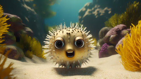 3D render of a cute pufferfish in the sea.
