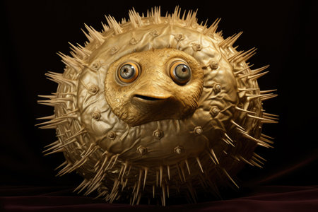 This image showcases a gold puffer fish with big, expressive eyes, captivating viewers with its unique appearance, An inflated texture of a blowfish, AI Generated