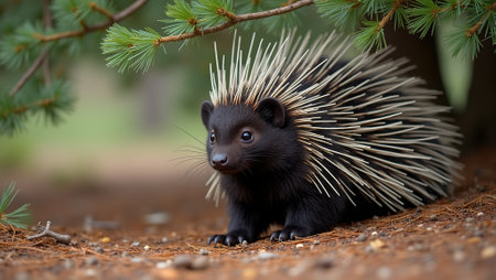 Detailed closeup of porcupine under pine tree bristling quills and fur pine needles on ground