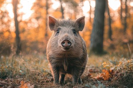 A wild boar stands inquisitively in a misty forest filled with autumn leaves. Soft light filters through the trees enhancing the serene atmosphere.