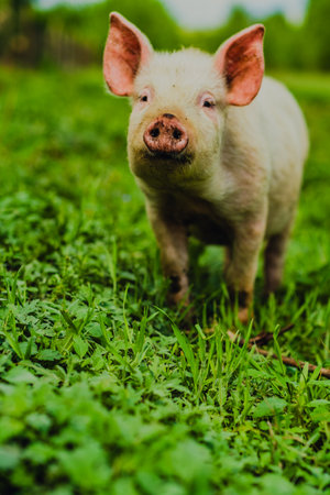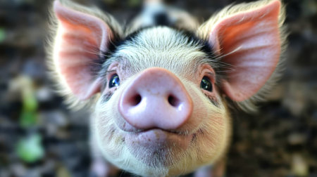 A close-up captures a pink piglet, highlighting its facial features under natural light. The composition emphasizes the animal's eyes and snout. The image exhibits soft textures and a shallow depth of field, with potential uses in various commercial and illustrative contexts. The setting is likely outdoors.