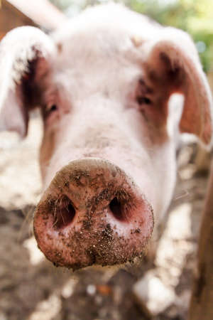 Happy pig with dirty snout poses for the camera. Domestic animals farming.