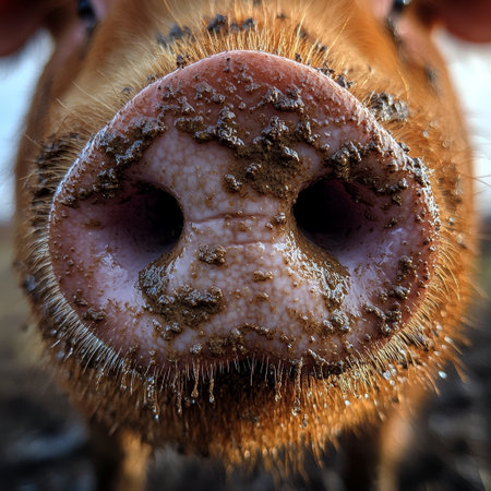 An extreme close-up captures the charming and detailed texture of a pigs snout. This intimate macro shot highlights the curious nature of farm life, focusing on the unique features and personality of the animal.