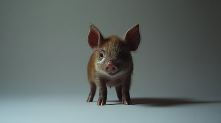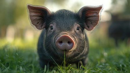 A charming piglet explores a sunlit farm field, showcasing its innocence and curiosity amidst the warm glow of golden hour, creating a peaceful rural scene.